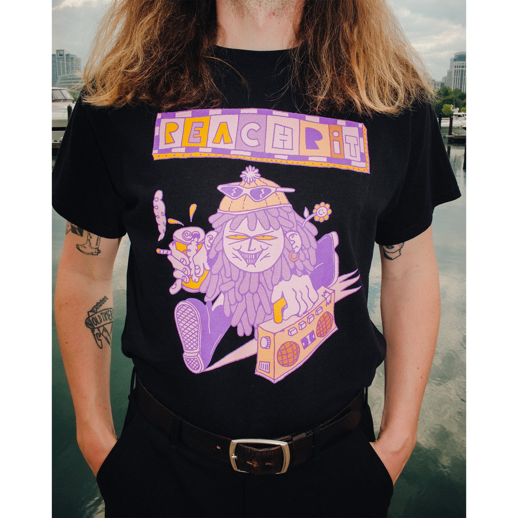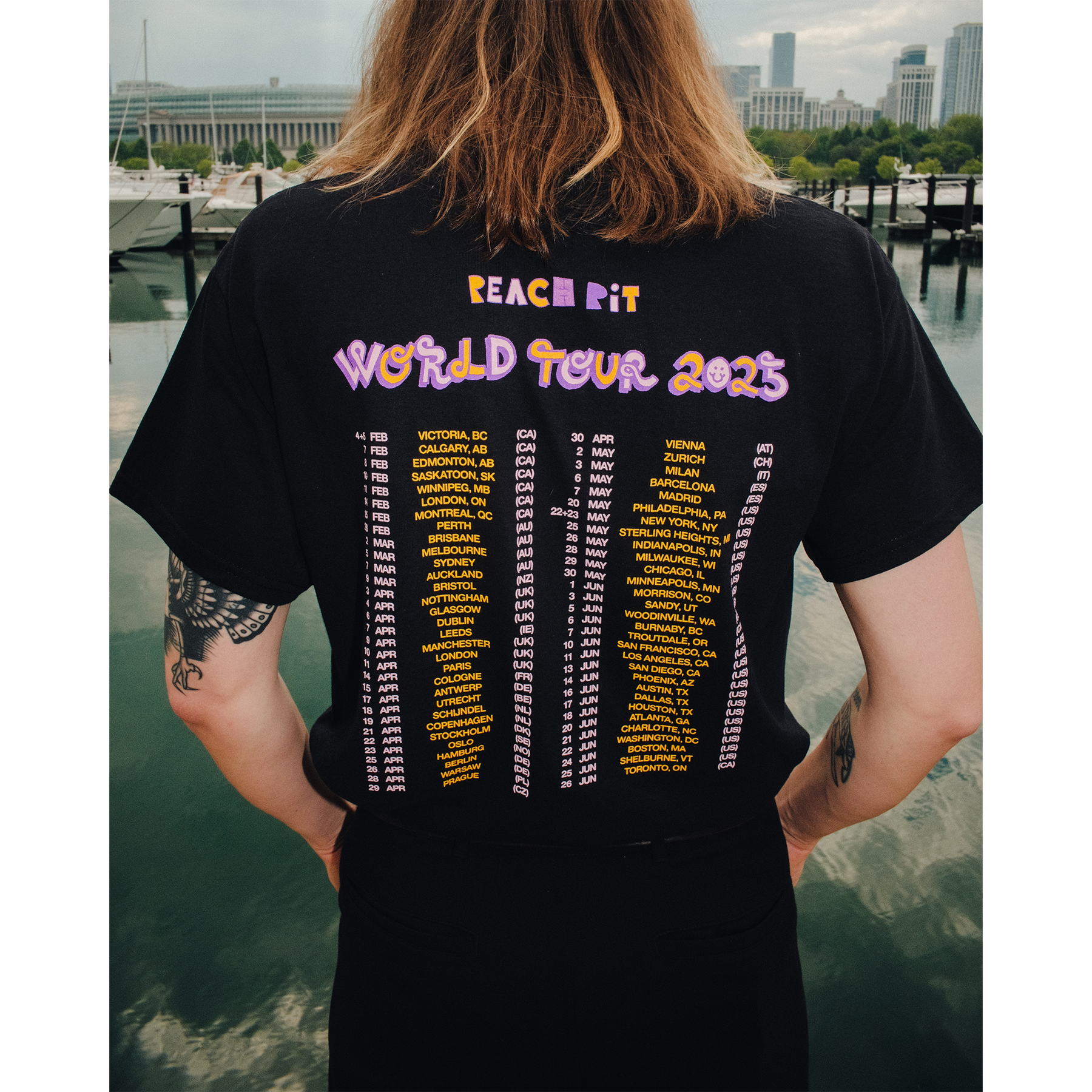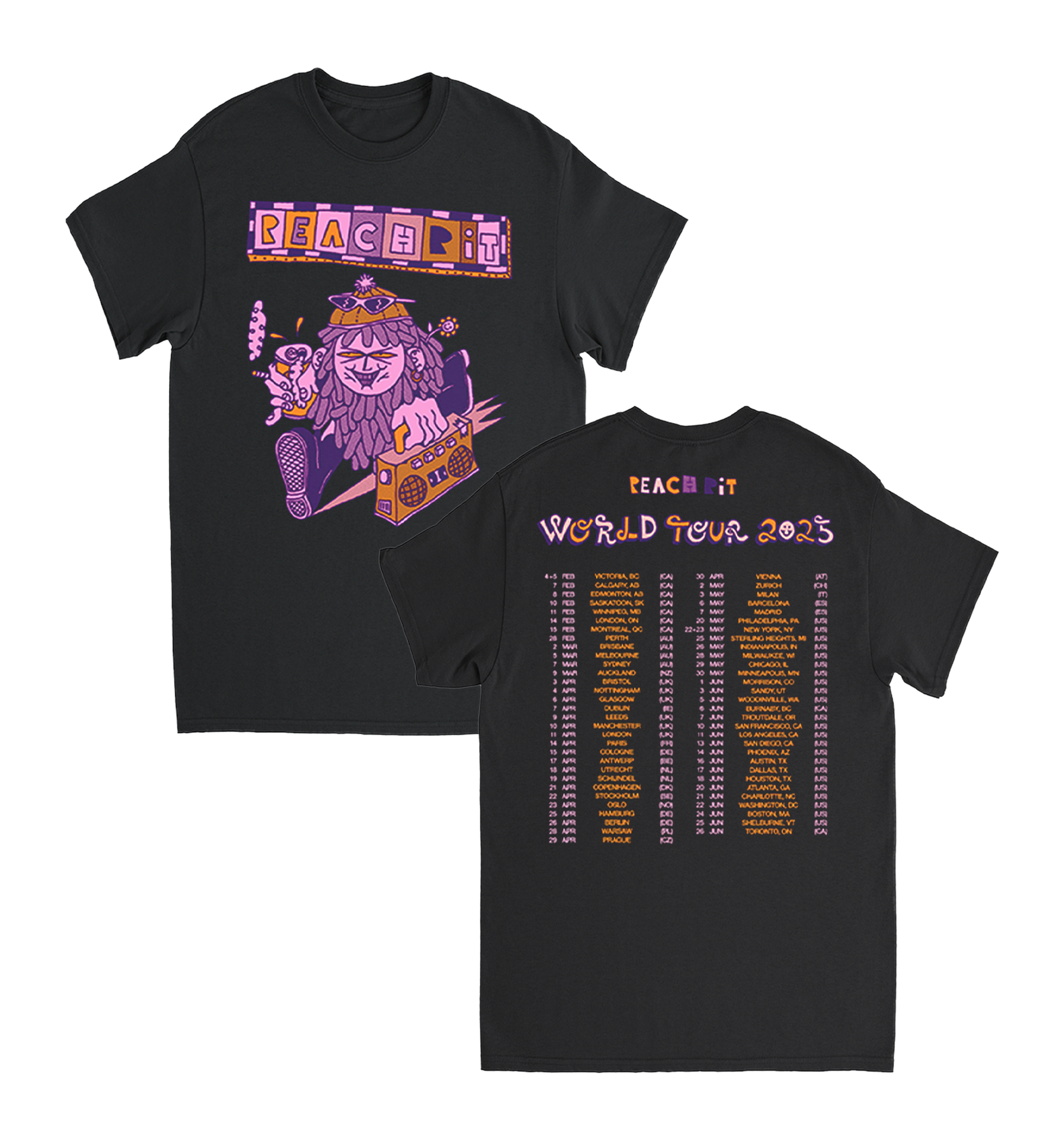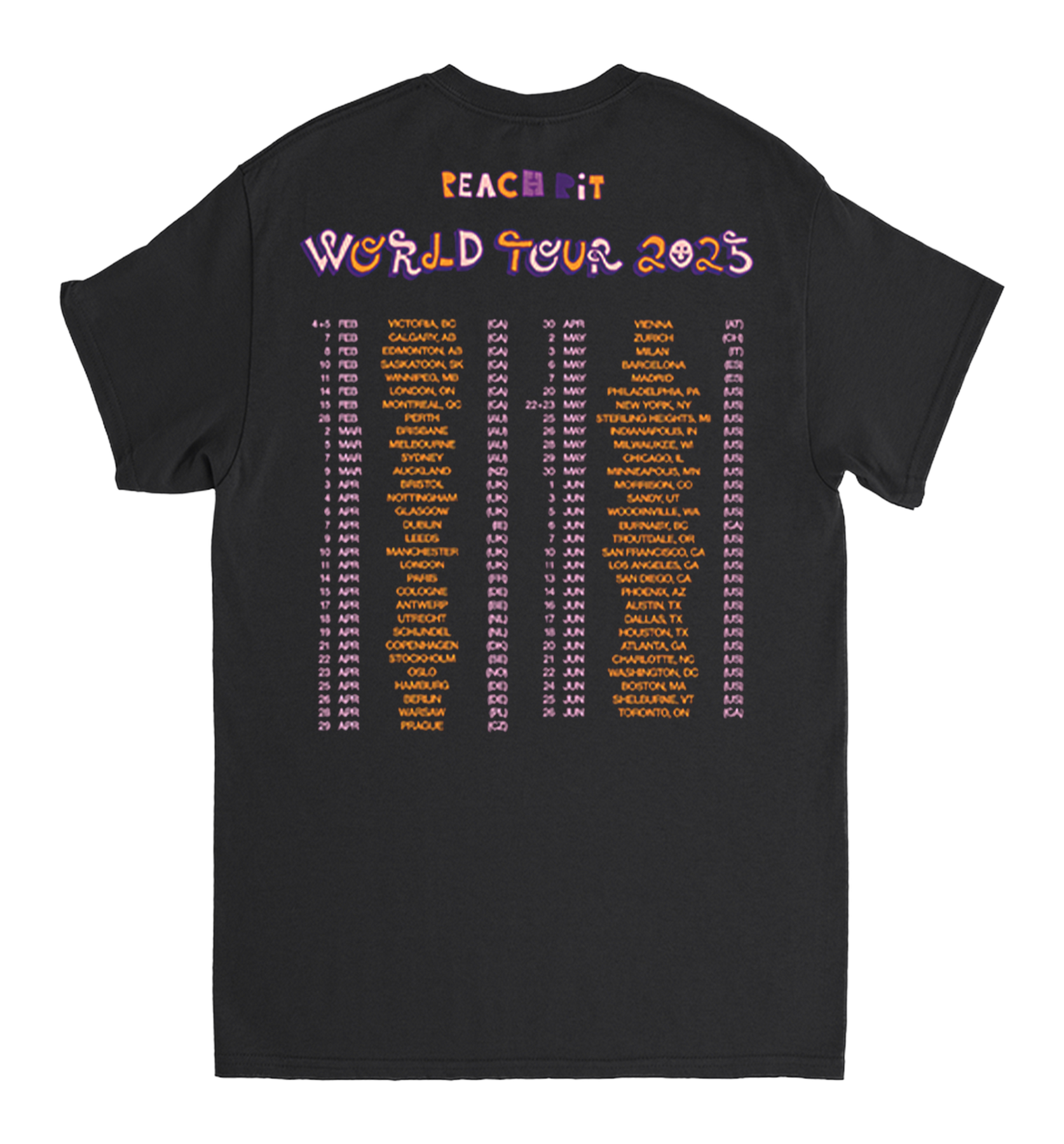 2025 World Tour design printed on the front and back of a black tee